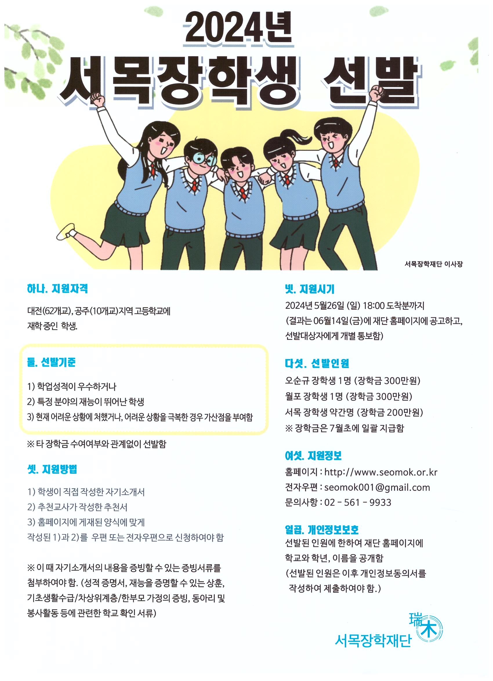 오순규 장학생 1명(장학금 300만원), 월포 장학생 1명(장학금 300만원), 서목 장학생 약간명(장학금 200만원) * 장학금은 7월 초에 일괄 지급함. 여섯. 지원정보 : 홈페이지 (www.seomok.or.kr), 전자우편(E-mail: seomok001@gmail.com), 기타 문의사항 : 02-561-9933 일곱. 개인정보보호 : 선발된 인원에 한하여 재단 홈페이지에 학교와 학년, 이름을 공개함. (선발된 인원은 이후 개인정보동의서를 작성하여 제출하여야 함.)